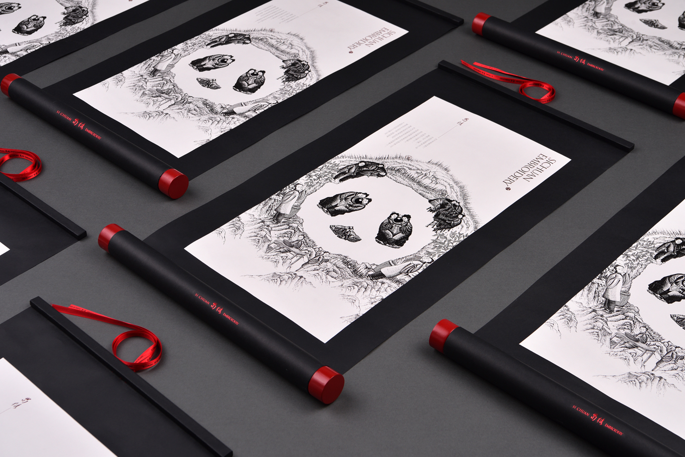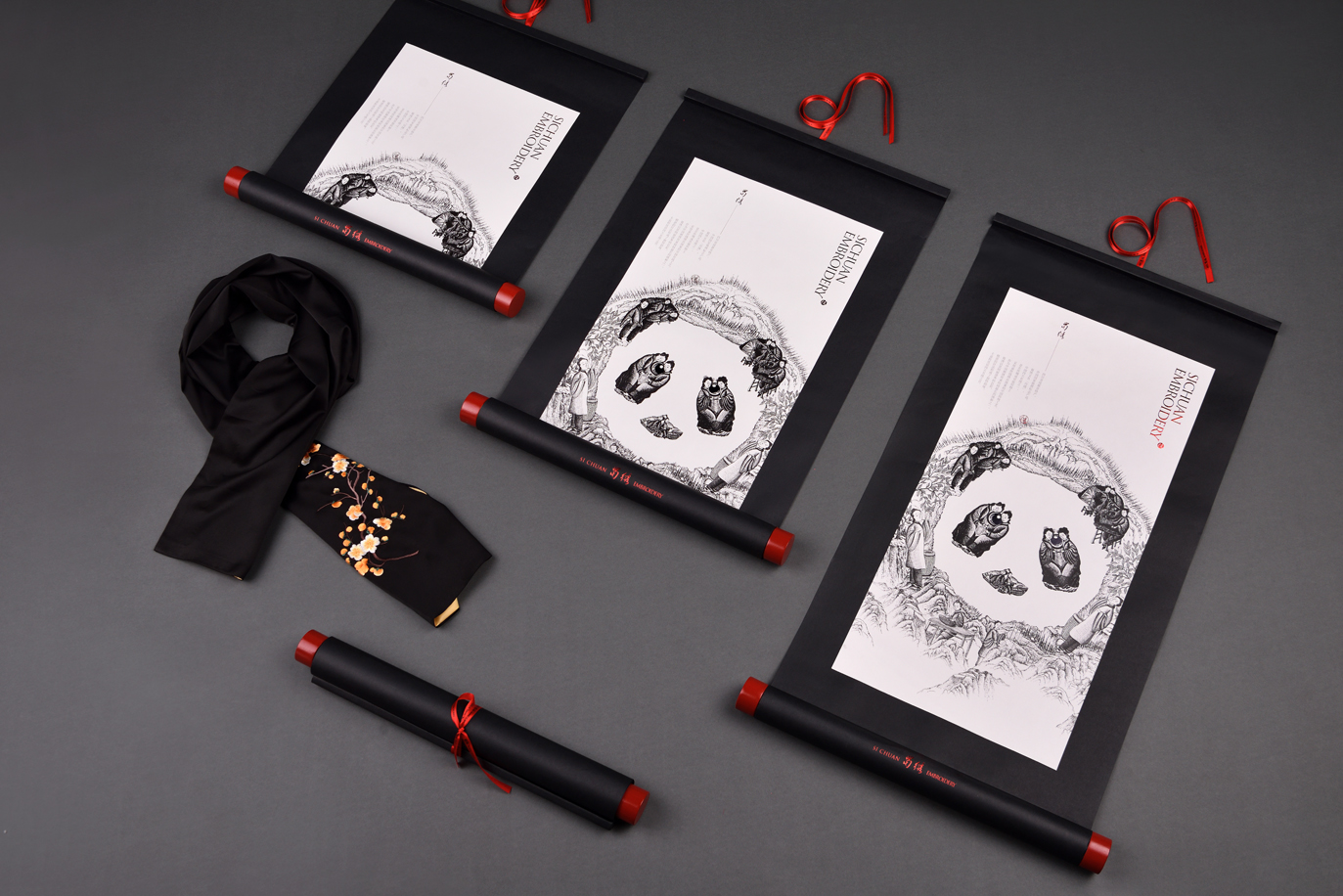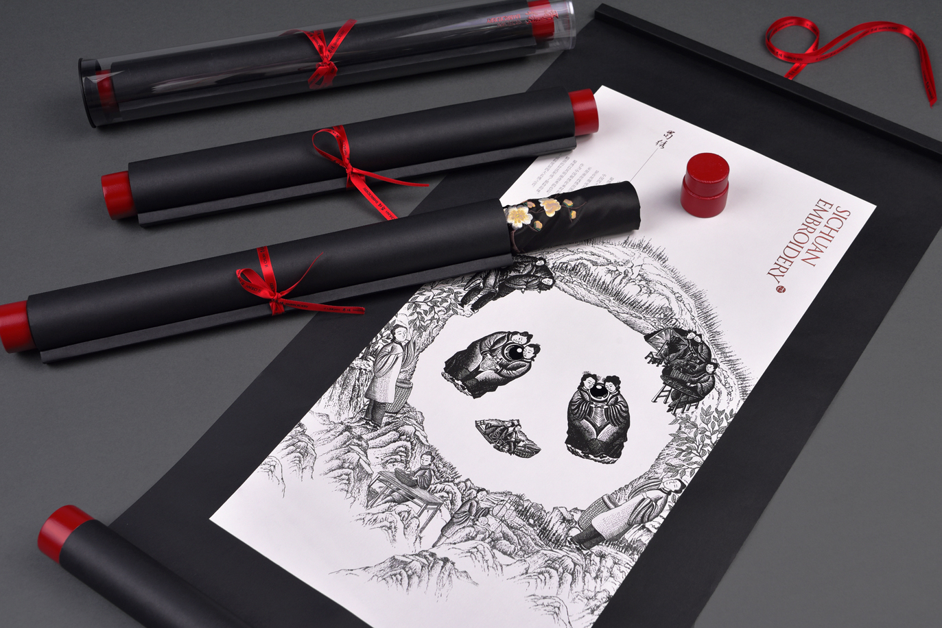 这款蜀绣丝巾是中国非物质文化遗产产品,包装采用中国古代传统的书画卷轴形态设计,将产品装入卷轴的里面。手绘插图是由多个刺绣人物组合构成一个熊猫形态,传递出中国传统手工刺绣过程的复杂与珍贵。同时,该作品整体形成了一幅中国山水意境画,以东方文化表达蜀绣内在意韵。包装在丝巾产品取出之后,也可以作为中国传统的装饰画挂起来,进行二次利用,减少包装丢弃,而更加环保,这样也更长时间的宣传了保护人类传统手工艺蜀绣的文化价值。