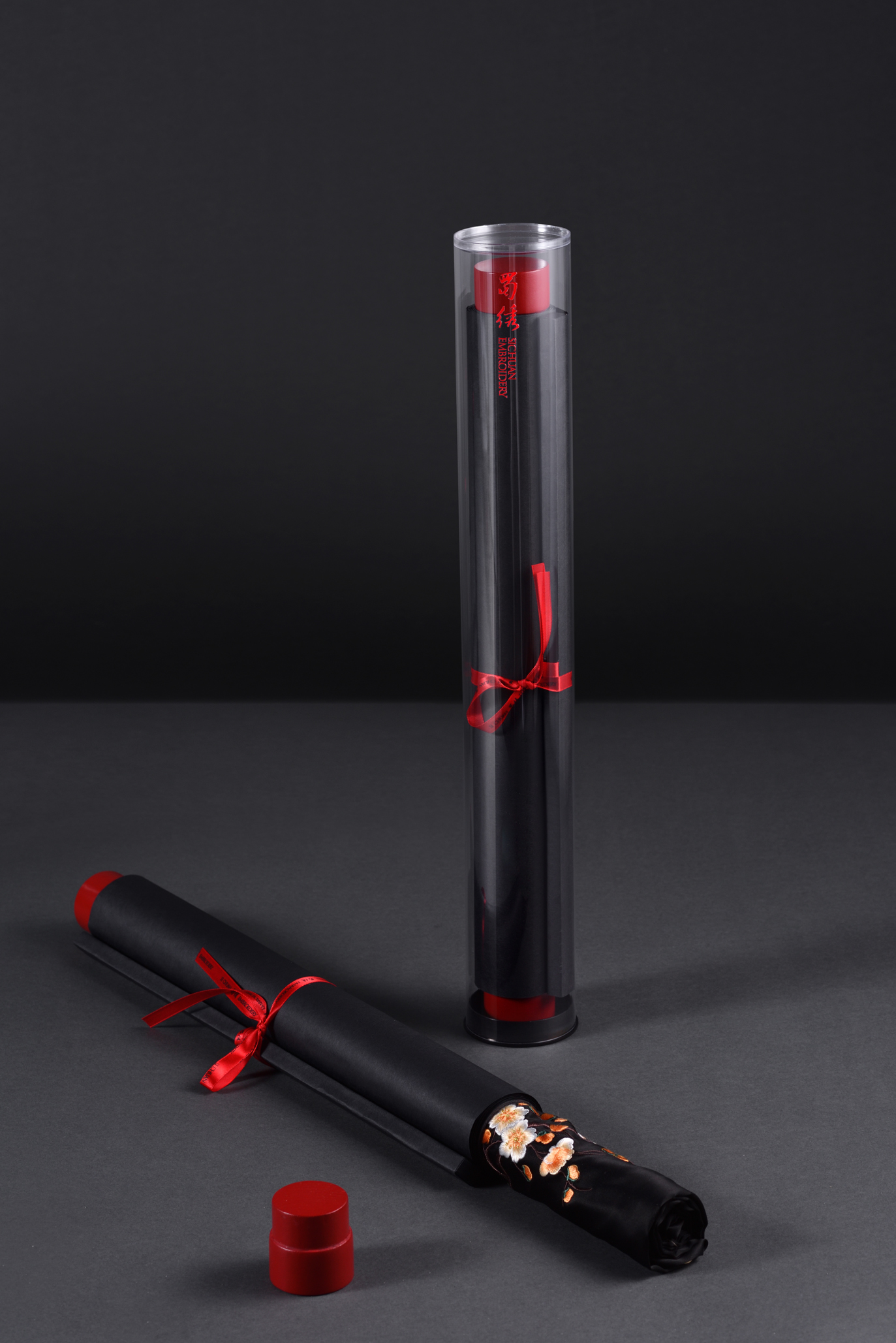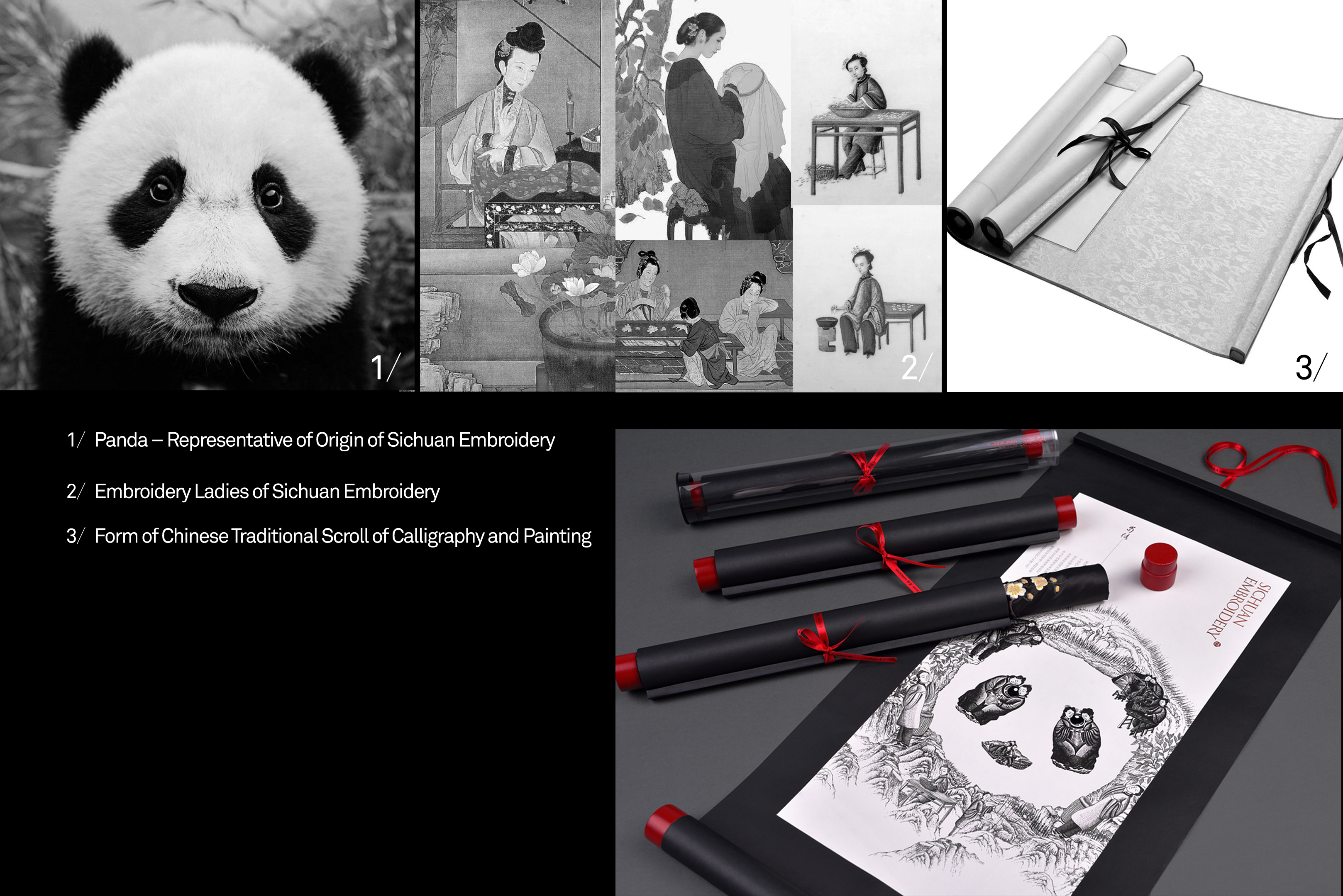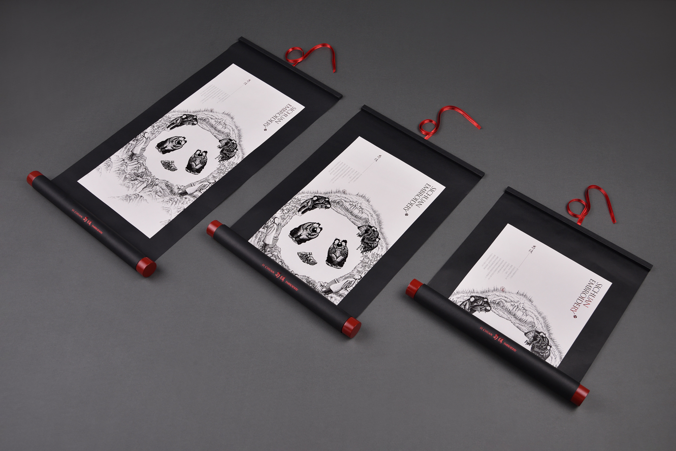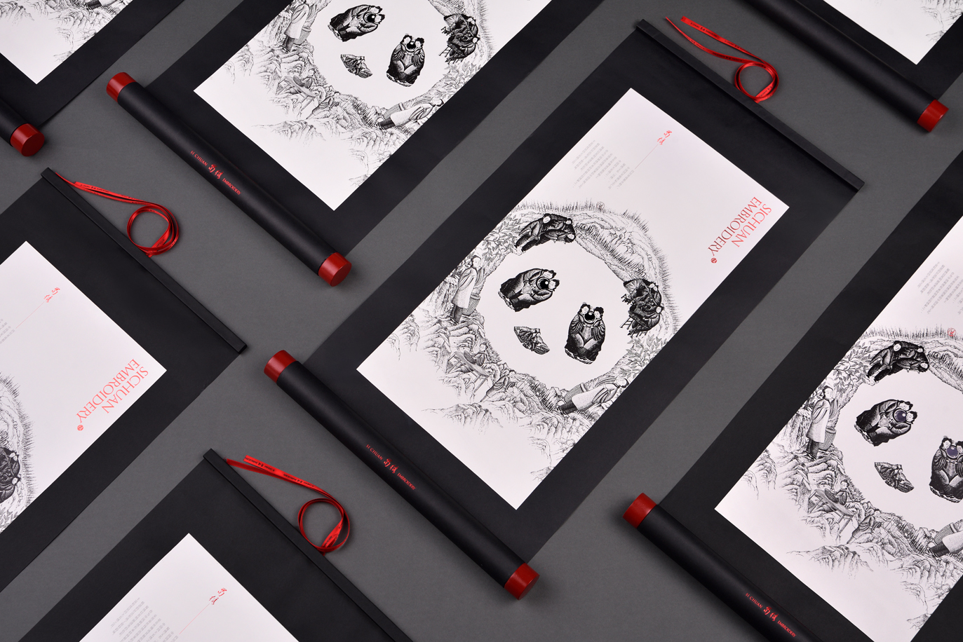 这款蜀绣丝巾是中国非物质文化遗产产品,包装采用中国古代传统的书画卷轴形态设计,将产品装入卷轴的里面。手绘插图是由多个刺绣人物组合构成一个熊猫形态,传递出中国传统手工刺绣过程的复杂与珍贵。同时,该作品整体形成了一幅中国山水意境画,以东方文化表达蜀绣内在意韵。包装在丝巾产品取出之后,也可以作为中国传统的装饰画挂起来,进行二次利用,减少包装丢弃,而更加环保,这样也更长时间的宣传了保护人类传统手工艺蜀绣的文化价值。
